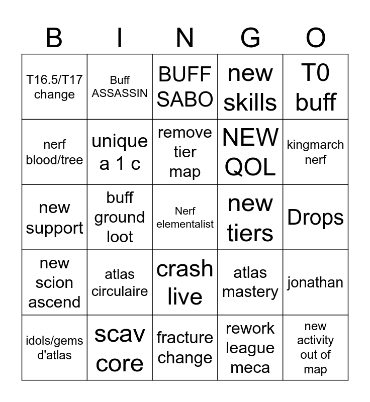 This bingo card has a free space and 24 words: atlas circulaire, scav core, remove tier map, idols/gems d'atlas, T0 buff, T16.5/T17 change, nerf blood/tree, Buff ASSASSIN, new tiers, crash live, NEW QOL, new support, atlas mastery, jonathan, unique a 1 c, rework league meca, Drops, BUFF SABO, kingmarch nerf, buff ground loot, new activity out of map, new scion ascend, new skills and fracture change.
