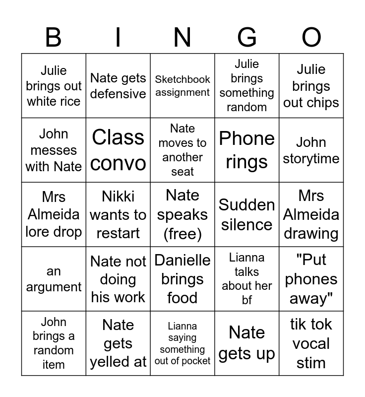 This bingo card has a free space and 24 words: Nate not doing his work, Nate gets yelled at, Nate moves to another seat, John brings a random item, Julie brings out chips, Julie brings out white rice, John messes with Nate, Nate gets defensive, Sudden silence, Danielle brings food, Phone rings, Mrs Almeida lore drop, Lianna talks about her bf, "Put phones away", Class convo, Nate gets up, Mrs Almeida drawing, Sketchbook assignment, John storytime, Nikki wants to restart, tik tok vocal stim, an argument, Julie brings something random and Lianna saying something out of pocket.