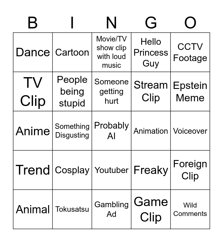 This bingo card has a free space and 24 words: Cosplay, Tokusatsu, Someone getting hurt, Animal, CCTV Footage, Dance, TV Clip, Cartoon, Animation, Youtuber, Stream Clip, Anime, Freaky, Foreign Clip, People being stupid, Game Clip, Voiceover, Movie/TV show clip with loud music, Epstein Meme, Something Disgusting, Wild Comments, Trend, Hello Princess Guy and Gambling Ad.