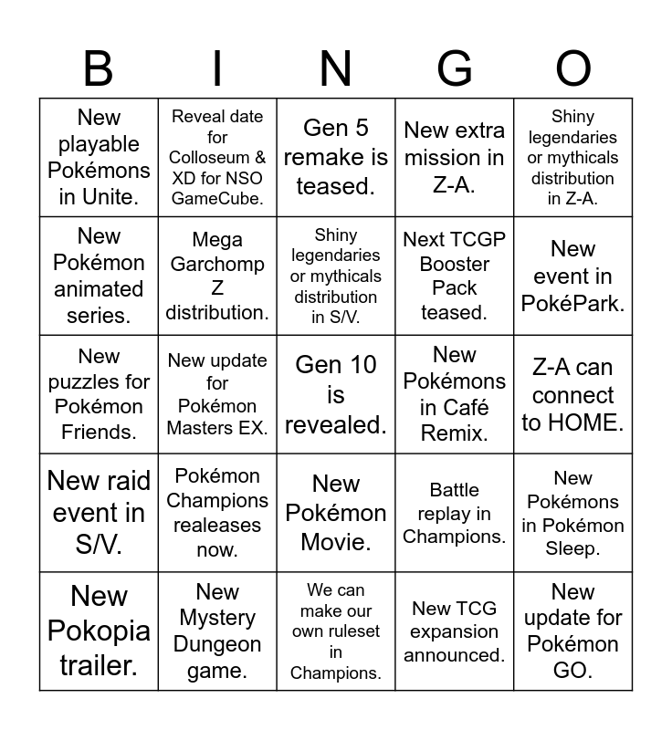This bingo card has a free space and 24 words: Pokémon Champions realeases now., New Mystery Dungeon game., Shiny legendaries or mythicals distribution in S/V., New Pokopia trailer., Shiny legendaries or mythicals distribution in Z-A., New playable Pokémons in Unite., New Pokémon animated series., Reveal date for Colloseum & XD for NSO GameCube., New Pokémons in Café Remix., New Pokémon Movie., Next TCGP Booster Pack teased., New puzzles for Pokémon Friends., Battle replay in Champions., New Pokémons in Pokémon Sleep., Mega Garchomp Z distribution., New TCG expansion announced., Z-A can connect to HOME., Gen 5 remake is teased., New event in PokéPark., New update for Pokémon Masters EX., New update for Pokémon GO., New raid event in S/V., New extra mission in Z-A. and We can make our own ruleset in Champions..