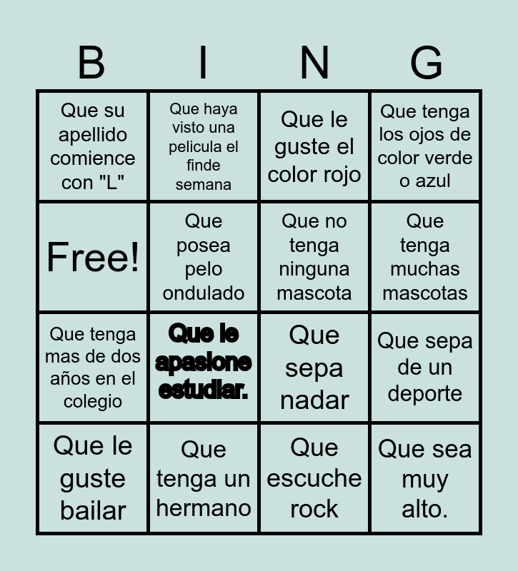 This bingo card has 16 words: Que tenga un hermano, Que sepa de un deporte, Que le guste el color rojo, Que su apellido comience con "L", Que tenga mas de dos años en el colegio, Que haya visto una pelicula el finde semana, Que sepa nadar, Que escuche rock, Free!, Que posea pelo ondulado, Que le guste bailar, Que tenga los ojos de color verde o azul, Que le apasione estudiar., Que tenga muchas mascotas, Que no tenga ninguna mascota and Que sea muy alto..