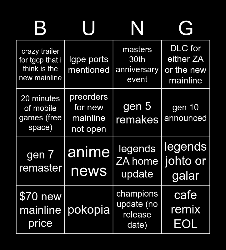 This bingo card has 16 words: pokopia, legends johto or galar, masters 30th anniversary event, crazy trailer for tgcp that i think is the new mainline, gen 7 remaster, lgpe ports mentioned, legends ZA home update, champions update (no release date), 20 minutes of mobile games (free space), preorders for new mainline not open, $70 new mainline price, DLC for either ZA or the new mainline, anime news, gen 10 announced, gen 5 remakes and cafe remix EOL.