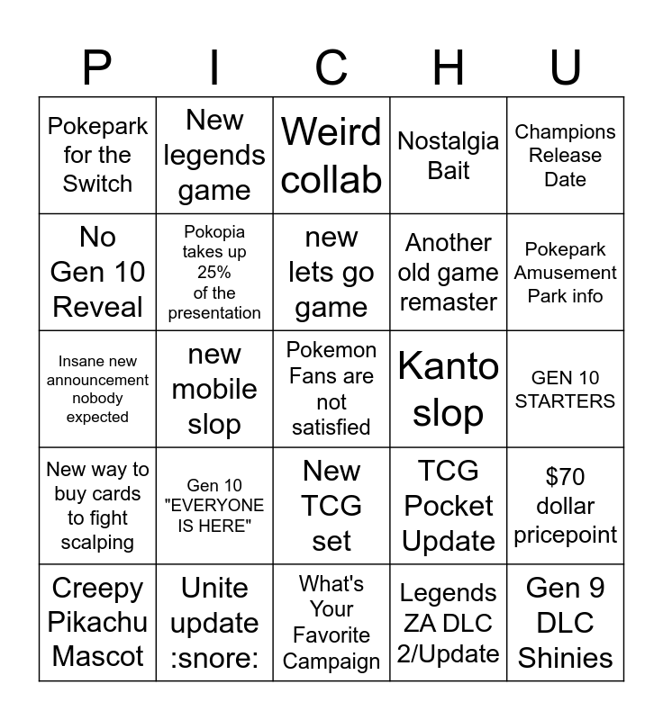 This bingo card has a free space and 29 words: Creepy Pikachu Mascot, brief firered/leafgreen mention, new mobile slop, Ash is mentioned/cameod, Pokepark for the Switch, Weird collab, Pokopia takes up 25% of the presentation, Gen 10 "EVERYONE IS HERE", Kanto slop, Unite update :snore:, GEN 10 STARTERS, Gen 9 DLC Shinies, What's Your Favorite Campaign, Legends ZA DLC 2/Update, Pokepark Amusement Park info, New Anime/ Movie, New TCG set, New way to buy cards to fight scalping, Champions Release Date, Insane new announcement nobody expected, TCG Pocket Update, Virtual Console teaser bait, Another old game remaster, No Gen 10 Reveal, Nostalgia Bait, New legends game, $70 dollar pricepoint, new lets go game and masters EX update.