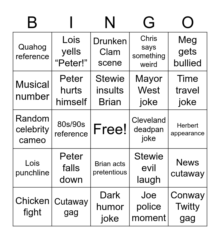 This bingo card has a free space and 24 words: Peter falls down, Cutaway gag, Stewie insults Brian, Chicken fight, Meg gets bullied, Quahog reference, Musical number, Lois yells “Peter!”, Cleveland deadpan joke, Brian acts pretentious, Mayor West joke, Random celebrity cameo, Stewie evil laugh, News cutaway, Peter hurts himself, Joe police moment, Herbert appearance, Drunken Clam scene, Time travel joke, 80s/90s reference, Conway Twitty gag, Lois punchline, Chris says something weird and Dark humor joke.