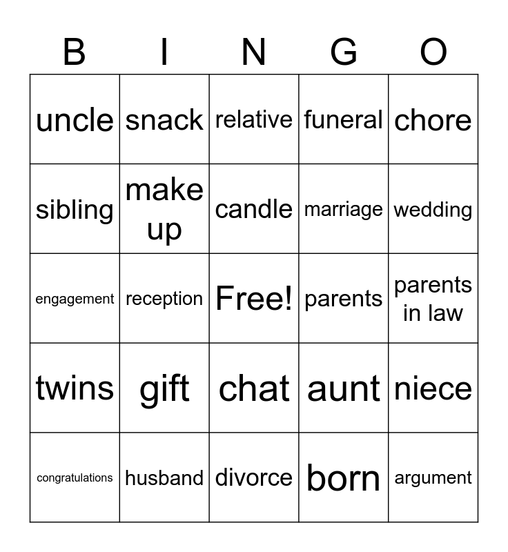 This bingo card has a free space and 27 words: aunt, couple, marriage, divorce, sibling, relative, snack, twins, parents, niece, engagement, funeral, congratulations, husband, wedding, ring, make up, candle, gift, uncle, parents in law, born, reception, argument, chat, chore and nap.