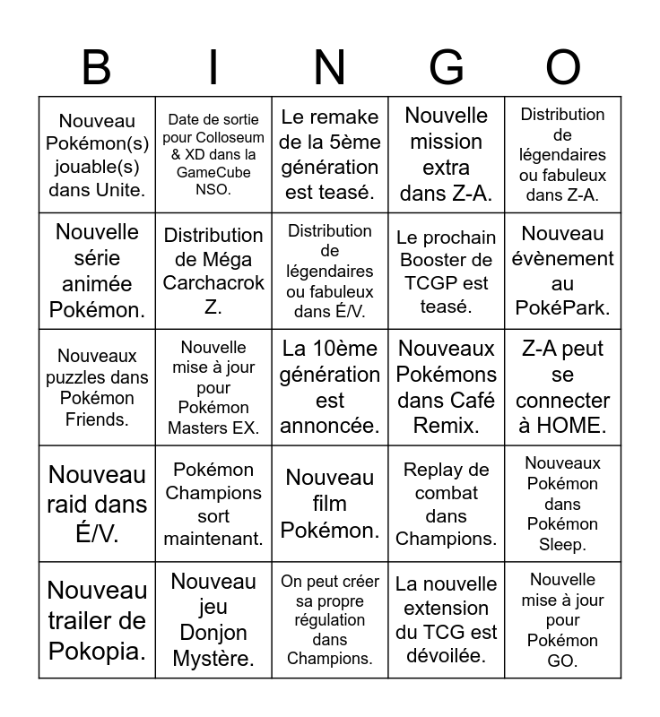 This bingo card has a free space and 24 words: Pokémon Champions sort maintenant., Nouveau jeu Donjon Mystère., Distribution de légendaires ou fabuleux dans É/V., Nouveau trailer de Pokopia., Distribution de légendaires ou fabuleux dans Z-A., Nouveau Pokémon(s) jouable(s) dans Unite., Nouvelle série animée Pokémon., Date de sortie pour Colloseum & XD dans la GameCube NSO., Nouveaux Pokémons dans Café Remix., Nouveau film Pokémon., Le prochain Booster de TCGP est teasé., Nouveaux puzzles dans Pokémon Friends., Replay de combat dans Champions., Nouveaux Pokémon dans Pokémon Sleep., Distribution de Méga Carchacrok Z., La nouvelle extension du TCG est dévoilée., Z-A peut se connecter à HOME., Le remake de la 5ème génération est teasé., Nouveau évènement au PokéPark., Nouvelle mise à jour pour Pokémon Masters EX., Nouvelle mise à jour pour Pokémon GO., Nouveau raid dans É/V., Nouvelle mission extra dans Z-A. and On peut créer sa propre régulation dans Champions..