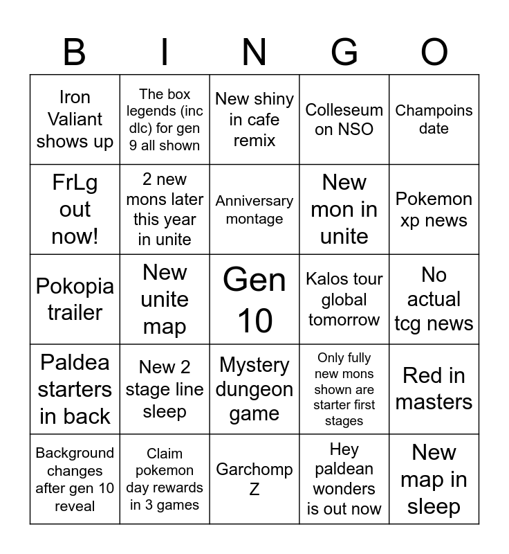 This bingo card has a free space and 24 words: New 2 stage line sleep, Claim pokemon day rewards in 3 games, Anniversary montage, Background changes after gen 10 reveal, Champoins date, Iron Valiant shows up, FrLg out now!, The box legends (inc dlc) for gen 9 all shown, Kalos tour global tomorrow, Mystery dungeon game, New mon in unite, Pokopia trailer, Only fully new mons shown are starter first stages, Red in masters, 2 new mons later this year in unite, Hey paldean wonders is out now, No actual tcg news, New shiny in cafe remix, Pokemon xp news, New unite map, New map in sleep, Paldea starters in back, Colleseum on NSO and Garchomp Z.