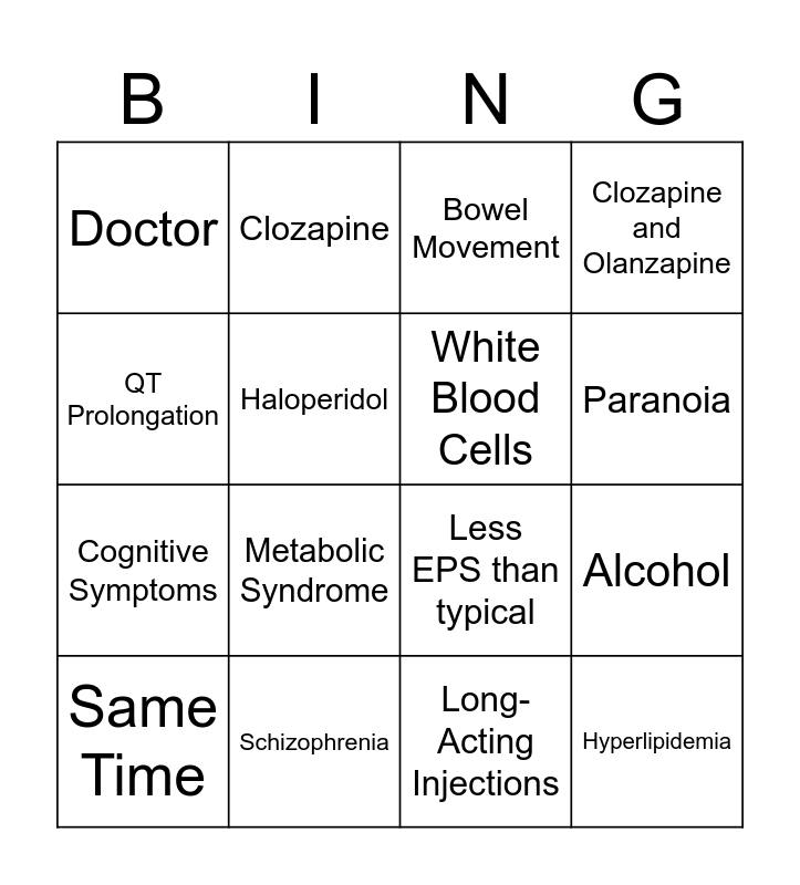 This bingo card has 29 words: Free!, Blood work, Alcohol, Water, Doctor, Bowel Movement, White Blood Cells, Room Temperature, Schizophrenia, Hallucinations, Long-Acting Injections, Same Time, Antipsychotics, Weight Gain, Metabolic Syndrome, Diabetes, Sedation, Hyperlipidemia, QT Prolongation, Less EPS than typical, Positive Symptoms, Negative Symptoms, Cognitive Symptoms, Haloperidol, Clozapine and Olanzapine, Clozapine, Delusions, Paranoia and ECT.