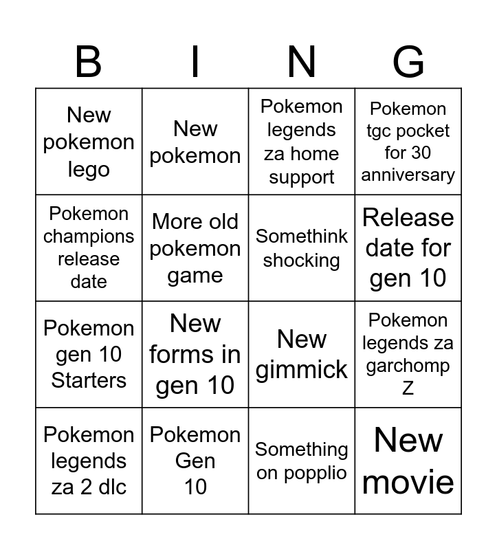 This bingo card has 16 words: Pokemon Gen 10, Pokemon legends za garchomp Z, Pokemon legends za home support, New pokemon lego, Pokemon gen 10 Starters, New pokemon, New gimmick, Something on popplio, Pokemon champions release date, More old pokemon game, Pokemon legends za 2 dlc, Pokemon tgc pocket for 30 anniversary, New forms in gen 10, Release date for gen 10, Somethink shocking and New movie.