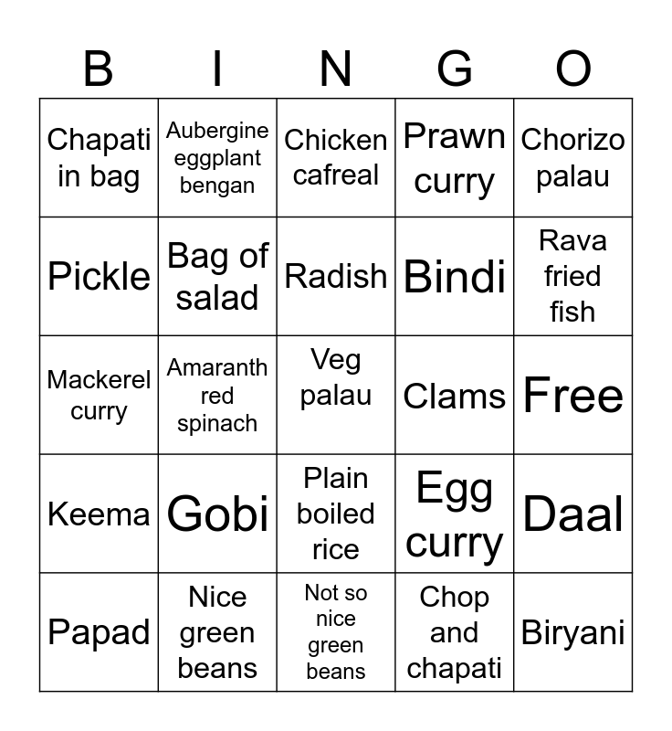 This bingo card has a free space and 24 words: Gobi, Nice green beans, Radish, Papad, Chorizo palau, Chapati in bag, Pickle, Aubergine eggplant bengan, Clams, Plain boiled rice, Bindi, Mackerel curry, Egg curry, Daal, Bag of salad, Chop and chapati, Free, Chicken cafreal, Rava fried fish, Amaranth red spinach, Biryani, Keema, Prawn curry and Not so nice green beans.