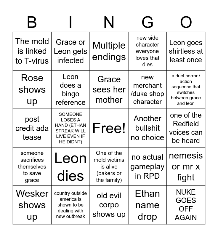 This bingo card has a free space and 24 words: Wesker shows up, Leon dies, Grace sees her mother, Ethan name drop, Leon goes shirtless at least once, The mold is linked to T-virus, Grace or Leon gets infected, Multiple endings, Another bullshit no choice, one of the Redfield voices can be heard, post credit ada tease, Leon does a bingo reference, no actual gameplay in RPD, nemesis or mr x fight, Rose shows up, country outside america is shown to be dealing with new outbreak, old evil corpo shows up, new side character everyone loves that dies, a duel horror / action sequence that switches between grace and leon, someone sacrifices themselves to save grace, SOMEONE LOSES A HAND (ETHAN STREAK WILL LIVE EVEN IF HE DIDNT), One of the mold victims is alive (bakers or the family), new merchant /duke shop character and NUKE GOES OFF AGAIN.
