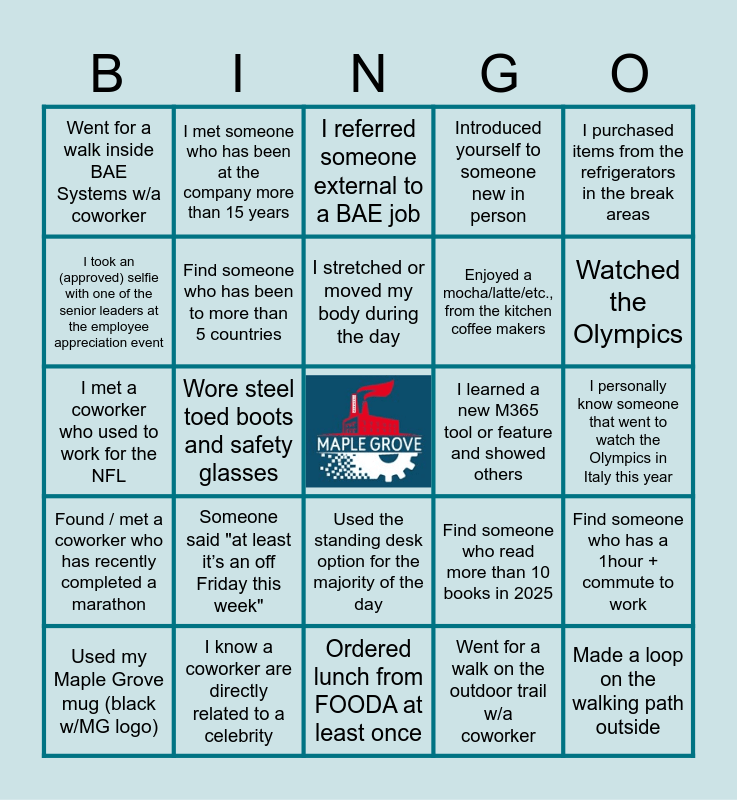 This bingo card has a free space and 49 words: Ate lunch with a coworker in the break room areas, Made a loop on the walking path outside, Overhead someone asking "can you hear me" while on a virtual meeting, Ordered lunch from FOODA at least once, Someone said "at least it’s an off Friday this week", Someone said "I have no idea what day it is", I met someone who has been at the company more than 15 years, I participated in the employee appreciation event on 3/10, I took an (approved) selfie with one of the senior leaders at the employee appreciation event, Find someone who has a desk plant, Find someone who has been to more than 5 countries, Introduced yourself to someone new in person, Find someone who has a 1hour + commute to work, Find someone who read more than 10 books in 2025, I completed a new ilearn training that wasn’t assigned to me, I asked an open-ended question to spark discussion in a meeting, I stretched or moved my body during the day, I learned a new M365 tool or feature and showed others, I completed the FOODA survey in the weekly communication, I purchased items from the refrigerators in the break areas, Wore steel toed boots and safety glasses, Went for a walk on the outdoor trail w/a coworker, Went for a walk inside BAE Systems w/a coworker, Enjoyed a mocha/latte/etc., from the kitchen coffee makers, LOVE my new workspace @ Maple Grove!, Watched the Olympics, Used my Maple Grove mug (black w/MG logo), Found someone close enough to facility to ride their bike to work, Used the standing desk option for the majority of the day, Found / met a coworker who has recently completed a marathon, I personally know an Olympian, Been to the movie theater in 2026, I played Pickleball at the recent employee holiday party, I dressed up for the previous Halloween Costume contest, I know a coworker are directly related to a celebrity, I have conducted meetings in 5 different conference rooms, I have helped report Safety concerns to SHE, I completed the Maple Grove Employee Suggestions Form, I personally know someone that went to watch the Olympics in Italy this year, I have helped a lost employee / visitor find a conference room, I submitted a STARS award this year, I specifically told my team that I appreciate them with Employee Appreciation Day on 3/6, I donated to a BAE sponsored charity, I met a coworker who has a hobby farm, I met a coworker who used to work for the NFL, I referred someone external to a BAE job, I made conversation with someone new in the hallway, I met someone who has been with BAE for over 30 years and I went to Costco for lunch.