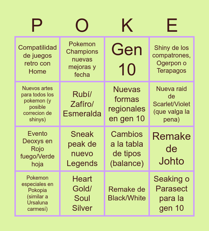 This bingo card has 16 words: Heart Gold/ Soul Silver, Remake de Johto, Gen 10, Compatilidad de juegos retro con Home, Evento Deoxys en Rojo fuego/Verde hoja, Pokemon Champions nuevas mejoras y fecha, Cambios a la tabla de tipos (balance), Remake de Black/White, Nuevos artes para todos los pokemon (y posible correcion de shinys), Rubí/ Zafíro/ Esmeralda, Pokemon especiales en Pokopia (similar a Ursaluna carmesí), Shiny de los compatrones, Ogerpon o Terapagos, Sneak peak de nuevo Legends, Nueva raid de Scarlet/Violet (que valga la pena), Nuevas formas regionales en gen 10 and Seaking o Parasect para la gen 10.