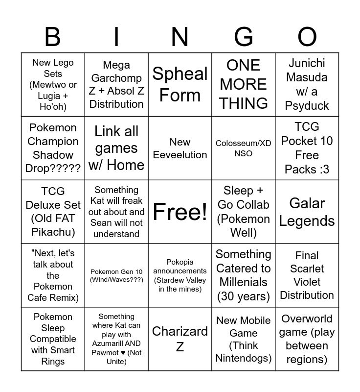 This bingo card has a free space and 25 words: Pokemon Gen 10 (WInd/Waves???), Charizard Z, New Eeveelution, Pokemon Sleep Compatible with Smart Rings, Junichi Masuda w/ a Psyduck, New Lego Sets (Mewtwo or Lugia + Ho'oh), Pokemon Champion Shadow Drop?????, Mega Garchomp Z + Absol Z Distribution, Sleep + Go Collab (Pokemon Well), Pokopia announcements (Stardew Valley in the mines), Colosseum/XD NSO, TCG Deluxe Set (Old FAT Pikachu), Something Catered to Millenials (30 years), Final Scarlet Violet Distribution, Link all games w/ Home, New Pokemon movie, Galar Legends, Spheal Form, TCG Pocket 10 Free Packs :3, Something Kat will freak out about and Sean will not understand, Overworld game (play between regions), Something where Kat can play with Azumarill AND Pawmot ♥ (Not Unite), "Next, let's talk about the Pokemon Cafe Remix), ONE MORE THING and New Mobile Game (Think Nintendogs).