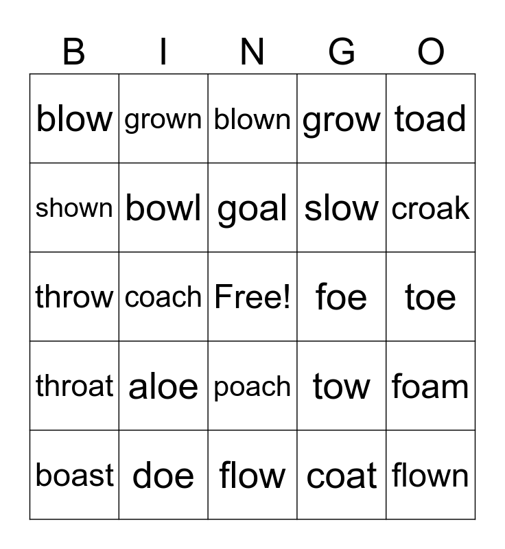 This bingo card has a free space and 29 words: boast, boat, coach, coal, blow, blown, bowl, aloe, foe, doe, toe, flown, flow, coat, croak, roach, poach, throat, toad, throw, tow, snow, slow, shown, grow, grown, foam, goal and moat.