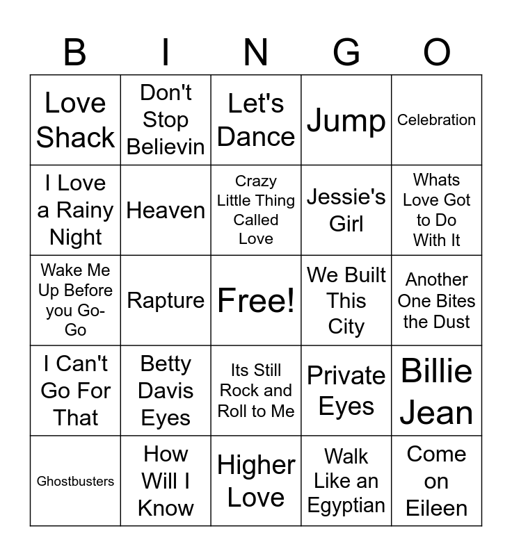 This bingo card has a free space and 68 words: Under Pressure, Come on Eileen, Livin on a Prayer, Girls Just Want to Have Fun, Pour Some Sugar on Me, Sweet Child o' Mine, Don't Stop Believin, I Wanna Dance With Somebody, Crazy Little Thing Called Love, Hungry Like the Wolf, Its Still Rock and Roll to Me, Magic, Another One Bites the Dust, Celebration, 9 to 5, I Love a Rainy Night, Rapture, Love Shack, Kiss on My List, Betty Davis Eyes, Jessie's Girl, Private Eyes, I Can't Go For That, I Love Rock and Roll, Eye of the Tiger, Abracadabra, Maneater, Africa, Billie Jean, Beat It, Let's Dance, Sweet Dreams (Are Made of This), Total Eclipse of the Heart, Karma Chameleon, Jump, Footloose, Let's Hear it For the Boy, Ghostbusters, Whats Love Got to Do With It, Wake Me Up Before you Go-Go, Can't Fight This Feeling, Don't You (Forget About Me), Heaven, Everybody Wants to Rule the World, Sussudio, The Power of Love, Money for Nothing, Take on Me, We Built This City, How Will I Know, Rock Me Amadeus, Addicted to Love, Papa Dont Preach, Higher Love, You Give Love a Bad Name, The Way It Is, Walk Like an Egyptian, Nothing's Going to Stop Us Now, You Keep Me Hanging On, La Bamba, Bad, Heaven Is A Place on Earth, Bad Medicine, Every Rose Has Its Thorn, We Didn't Start the Fire, Material Girl, I Think We Are Alone Now and Tainted Love.