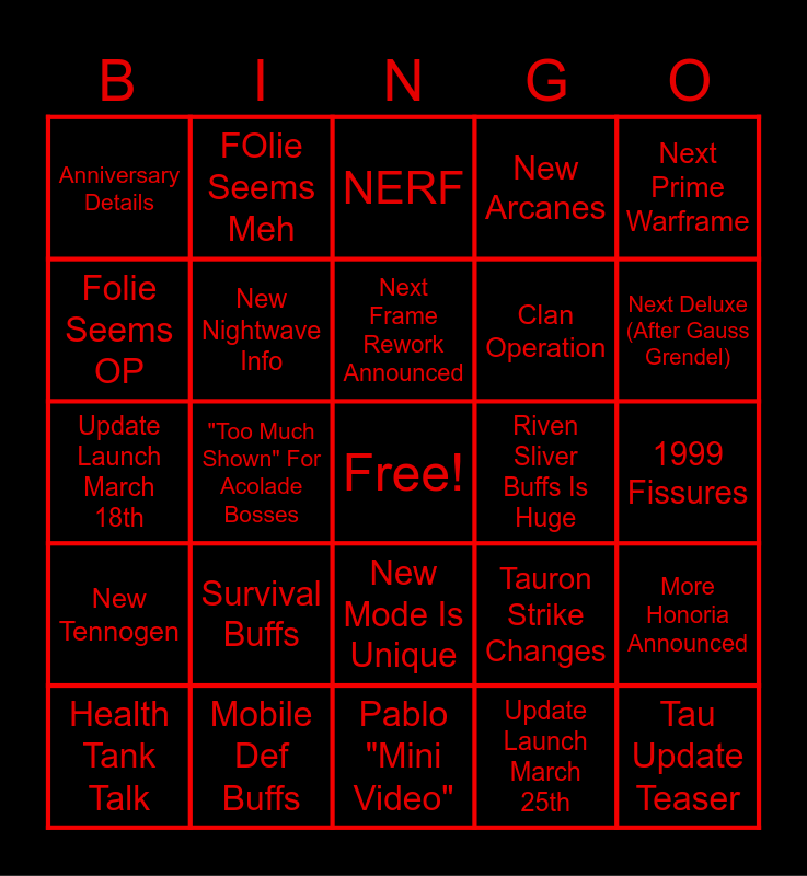 This bingo card has a free space and 24 words: Survival Buffs, Mobile Def Buffs, Next Frame Rework Announced, Health Tank Talk, Next Prime Warframe, Anniversary Details, Folie Seems OP, FOlie Seems Meh, Riven Sliver Buffs Is Huge, New Mode Is Unique, Clan Operation, Update Launch March 18th, Tauron Strike Changes, More Honoria Announced, New Nightwave Info, Update Launch March 25th, 1999 Fissures, NERF, Next Deluxe (After Gauss Grendel), "Too Much Shown" For Acolade Bosses, Tau Update Teaser, New Tennogen, New Arcanes and Pablo "Mini Video".