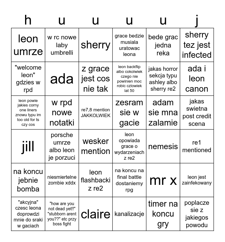 This bingo card has 36 words: na koncu na final battle dostaniemy rpg, leon flashbacki z re2, kanalizacje, "welcome leon" gdzies w rpd, jill, zesram sie w gacie, ada, claire, bede grac jedna reka, mr x, ada i leon canon, grace bedzie musiala uratowac leona, leon jest zainfekowany, w rpd nowe notatki, leon backflip albo cokolwiek czego nie powinien moc robic czlowiek lat 50, leon umrze, na koncu jebnie bomba, adam sie mna zalamie, leon powie jakies corny one liners znowu typu im too old for ts czy cos, sherry, re7,8 mention JAKKOLWIEK, porsche umrze albo leon je porzuci, leon opowiada grace o wydarzeniach z re2, wesker mention, nemesis, w rc nowe laby umbrelli, jakas horror sekcja typu ashley albo sherry re2, "how are you not dead yet!!" "stubborn arent you??" etc przy boss fight, z grace jest cos nie tak, sherry tez jest infected, poplacze sie z jakiegos powodu, "akcyjna" czesc leona doprowdzi mnie do sraki w gaciach, re1 mentioned, jakas swietna post credit scena, niesmiertelne zombie xddx and timer na koncu gry.