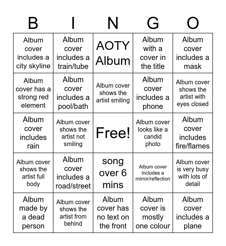 This bingo card has a free space and 118 words: Soundtrack Album, Album released this year, 90's hip hop album, album over 15 tracks, album with one word title, Album I've heard, Album with a cover in the title, ALBUM BY BAND, Hidden fts, more than 7 fts, red album cover, album with no title on the cover, Album over 1H and 30M, album before 1H, Dropped in 2010's, Album with a number in the title, song over 6 mins, Debut Album, Album made in 2020, Collab Album, Album made by a dead person, AOTY Album, Album i want on vinyl, alter ego album, Album cover shows the artist’s face close-up, Album cover shows the artist full body, Album cover shows the artist from behind, Album cover shows the artist in profile, Album cover shows the artist looking directly at the camera, Album cover shows the artist looking away from the camera, Album cover shows the artist with eyes closed, Album cover shows the artist smiling, Album cover shows the artist not smiling, Album cover shows the artist with hands covering their face, Album cover shows the artist with arms crossed, Album cover shows the artist with hands in pockets, Album cover shows the artist sitting, Album cover shows the artist standing, Album cover shows the artist lying down, Album cover shows the artist walking, Album cover shows the artist dancing, Album cover shows two people, Album cover shows three or more people, Album cover shows a crowd, Album cover shows no people, Album cover is black and white, Album cover is mostly one colour, Album cover has a strong red element, Album cover has a strong blue element, Album cover has a strong green element, Album cover has a strong pink element, Album cover looks like a candid photo, Album cover looks like a studio photo, Album cover looks like a film still, Album cover has noticeable film grain, Album cover is heavily edited/graphic, Album cover is a drawing/illustration, Album cover is a collage, Album cover has a border/frame around the image, Album cover has lots of empty space, Album cover is very busy with lots of detail, Album cover includes the sun, Album cover includes the moon, Album cover includes stars, Album cover includes clouds, Album cover includes water, Album cover includes a beach/sea, Album cover includes a pool/bath, Album cover includes rain, Album cover includes snow/ice, Album cover includes fire/flames, Album cover includes flowers, Album cover includes trees/forest, Album cover includes animals, Album cover includes a car, Album cover includes a train/tube, Album cover includes a plane, Album cover includes a road/street, Album cover includes a city skyline, Album cover includes a house/building, Album cover includes a bedroom/bed, Album cover includes a chair/sofa, Album cover includes a door, Album cover includes a window, Album cover includes a mirror/reflection, Album cover includes a TV/screen, Album cover includes a phone, Album cover includes a camera, Album cover includes headphones, Album cover includes a microphone, Album cover includes a speaker, Album cover includes a record/vinyl, Album cover includes a book/newspaper, Album cover includes food or drink, Album cover includes smoke or a cigarette, Album cover includes a mask, Album cover includes sunglasses, Album cover includes a hat/cap, Album cover includes jewellery (chain/rings), Album cover includes tattoos, Album cover includes a heart shape, Album cover includes a cross symbol, Album cover includes a crown, Album cover includes a big circle motif, Album cover includes a triangle motif, Album cover has repeating patterns, Album cover uses split panels (two halves), Album cover uses a mirror/double image effect, Album cover has the artist name on the front, Album cover has the album title on the front, Album cover has no text on the front, Album cover uses handwritten text, Album cover text is all caps, Album cover text is all lowercase, Album cover text is centred, Album cover text is tiny and hard to notice, Album cover includes a parental advisory label and Album cover has a sticker/label design element.