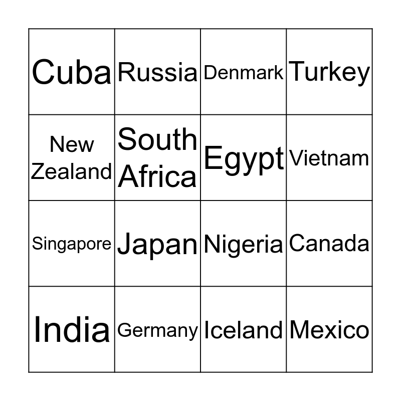 This bingo card has 30 words: Australia, Belgium, Canada, China, Cuba, Denmark, Egypt, France, Germany, Hungary, Iceland, India, Ireland, Jamaica, Japan, Korea, Libya, Mexico, Morocco, New Zealand, Nigeria, Philippines, Russia, Singapore, South Africa, Turkey, United Kingdom, United States, Vietnam and Zimbabwe.