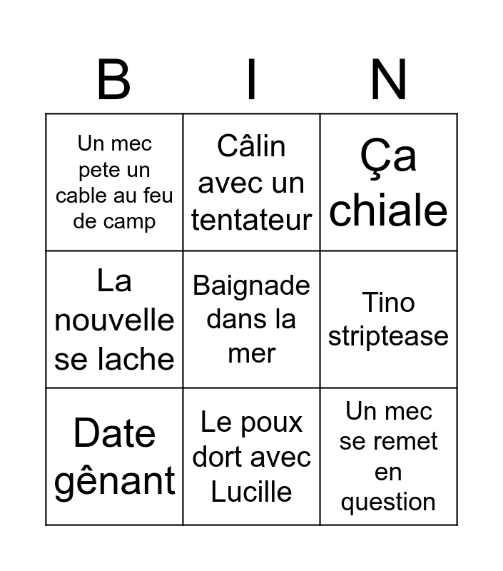 This bingo card has a free space and 8 words: Tino striptease, Ça chiale, Câlin avec un tentateur, Date gênant, Un mec pete un cable au feu de camp, Un mec se remet en question, La nouvelle se lache and Le poux dort avec Lucille.