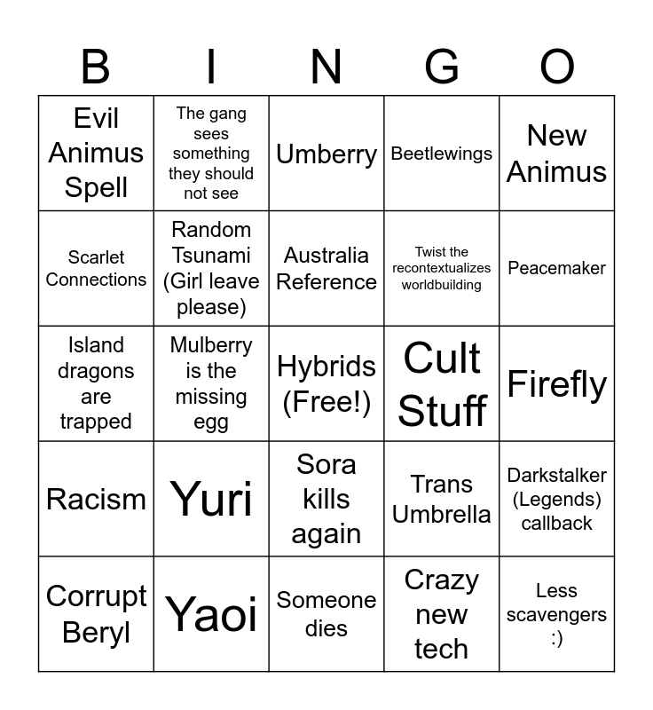 This bingo card has a free space and 24 words: Yuri, Yaoi, Australia Reference, Corrupt Beryl, New Animus, Evil Animus Spell, Scarlet Connections, The gang sees something they should not see, Cult Stuff, Sora kills again, Twist the recontextualizes worldbuilding, Island dragons are trapped, Trans Umbrella, Darkstalker (Legends) callback, Random Tsunami (Girl leave please), Crazy new tech, Firefly, Umberry, Peacemaker, Mulberry is the missing egg, Less scavengers :), Racism, Beetlewings and Someone dies.