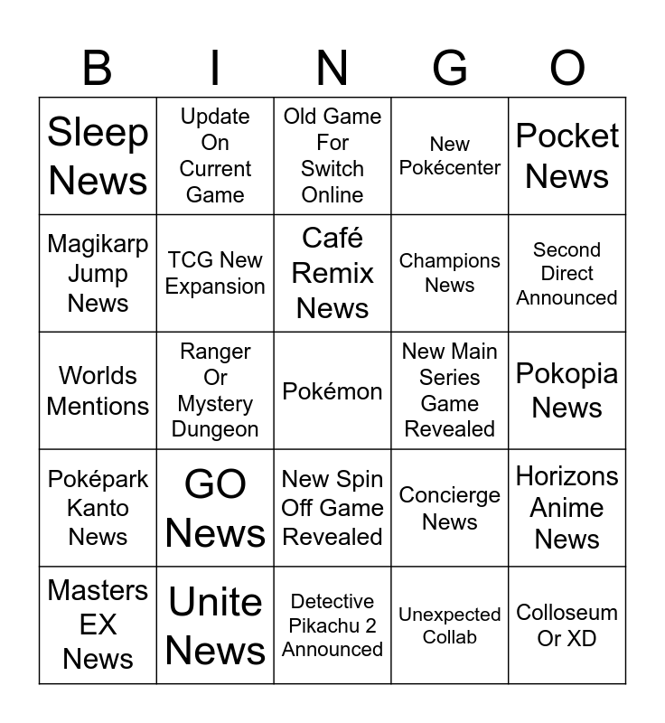 This bingo card has a free space and 24 words: GO News, Unite News, Café Remix News, Masters EX News, Pocket News, Sleep News, Magikarp Jump News, Update On Current Game, New Main Series Game Revealed, New Spin Off Game Revealed, Champions News, Worlds Mentions, Concierge News, Horizons Anime News, TCG New Expansion, Unexpected Collab, Pokopia News, Old Game For Switch Online, Second Direct Announced, Ranger Or Mystery Dungeon, Colloseum Or XD, Poképark Kanto News, New Pokécenter and Detective Pikachu 2 Announced.