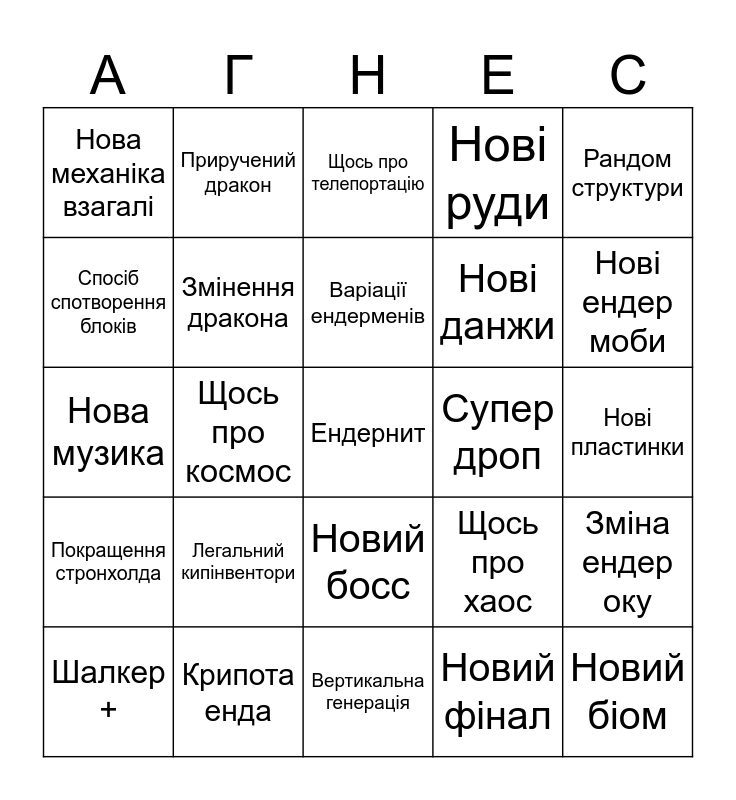 This bingo card has a free space and 24 words: Легальний кипінвентори, Крипота енда, Варіації ендерменів, Шалкер +, Рандом структури, Нова механіка взагалі, Спосіб спотворення блоків, Приручений дракон, Супер дроп, Новий босс, Нові данжи, Нова музика, Щось про хаос, Зміна ендер оку, Змінення дракона, Новий фінал, Нові пластинки, Щось про телепортацію, Нові ендер моби, Щось про космос, Новий біом, Покращення стронхолда, Нові руди and Вертикальна генерація.