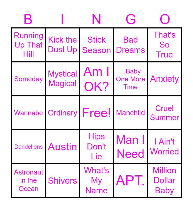 This bingo card has a free space and 36 words: Opalite, No Broke Boys, 12 to 12, Mystical Magical, Man I Need, Dandelions, Am I OK?, I Had Some Help, That's So True, Bejeweled, Ordinary, Bad Dreams, Love Me Not, Manchild, Anxiety, Running Up That Hill, A Bar Song, Austin, Million Dollar Baby, Stick Season, Cruel Summer, I Ain't Worried, Shivers, Astronaut in the Ocean, What's My Name, Kick the Dust Up, Wannabe, I Want It That Way, ...Baby One More Time, Someday, Chanel, Starships, APT., Hips Don't Lie, Watermelon Sugar and Greedy.