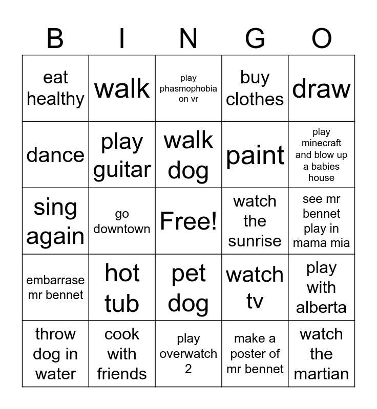This bingo card has a free space and 24 words: hot tub, cook with friends, walk dog, throw dog in water, draw, eat healthy, dance, walk, watch the sunrise, pet dog, paint, sing again, watch tv, play with alberta, play guitar, make a poster of mr bennet, see mr bennet play in mama mia, play phasmophobia on vr, play minecraft and blow up a babies house, go downtown, watch the martian, embarrase mr bennet, buy clothes and play overwatch 2.