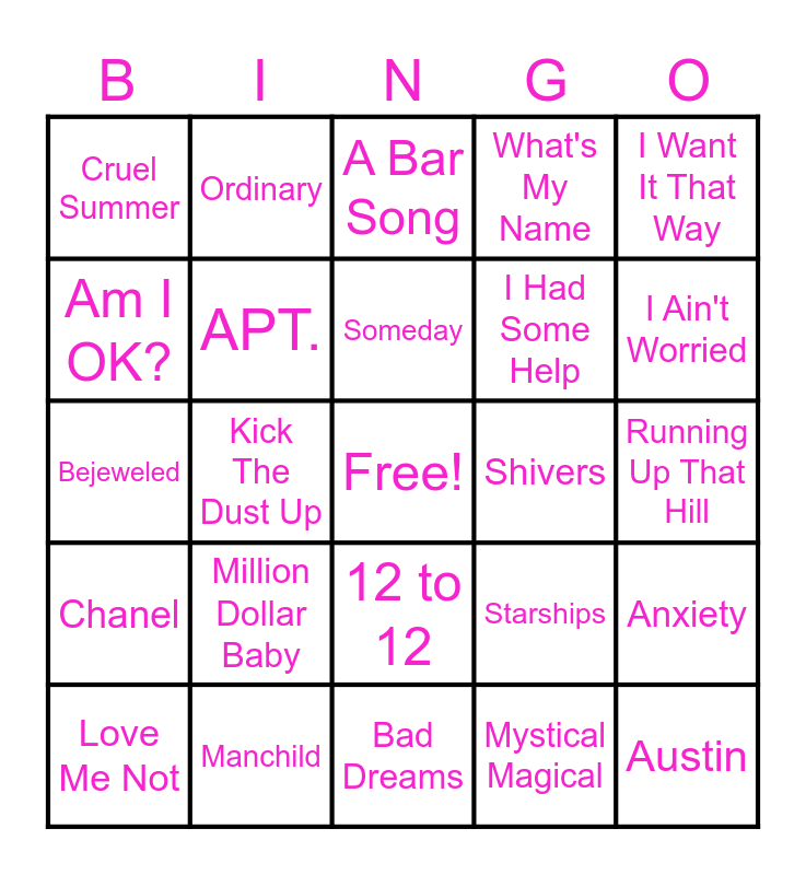 This bingo card has a free space and 36 words: Greedy, Watermelon Sugar, Hips Don't Lie, APT., Starships, Chanel, Someday, ...Baby One More Time, I Want It That Way, Wannabe, Kick The Dust Up, What's My Name, Astronaut In The Ocean, Shivers, I Ain't Worried, Cruel Summer, Stick Season, Million Dollar Baby, Austin, A Bar Song, Running Up That Hill, Anxiety, Manchild, Love Me Not, Bad Dreams, Ordinary, Bejeweled, That's So True, I Had Some Help, Am I OK?, Dandelions, Man I Need, Mystical Magical, 12 to 12, No Broke Boys and Opalite.