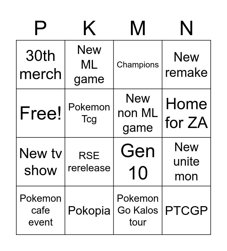 This bingo card has 16 words: Pokopia, New unite mon, Champions, 30th merch, New tv show, New ML game, Gen 10, Pokemon Go Kalos tour, Free!, Pokemon Tcg, Pokemon cafe event, New remake, RSE rerelease, Home for ZA, New non ML game and PTCGP.