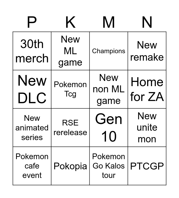 This bingo card has 16 words: Pokopia, New unite mon, Champions, 30th merch, New animated series, New ML game, Gen 10, Pokemon Go Kalos tour, New DLC, Pokemon Tcg, Pokemon cafe event, New remake, RSE rerelease, Home for ZA, New non ML game and PTCGP.