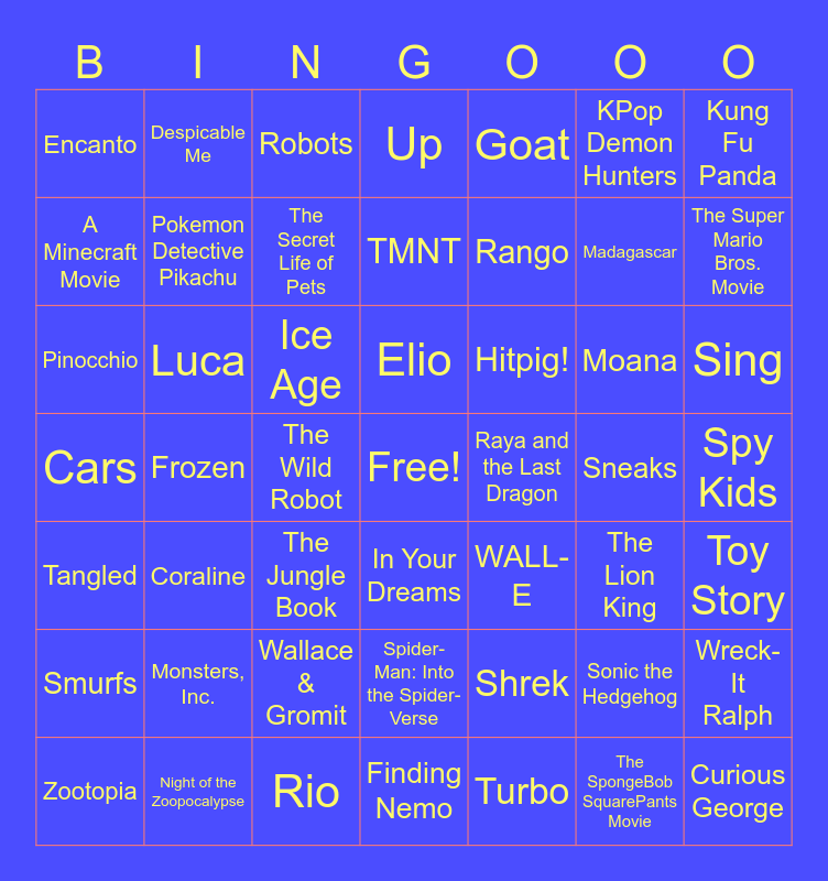 This bingo card has a free space and 48 words: Shrek, Madagascar, Finding Nemo, Frozen, Ice Age, Spy Kids, Despicable Me, Night of the Zoopocalypse, KPop Demon Hunters, In Your Dreams, Kung Fu Panda, Up, Moana, Hitpig!, Smurfs, Sneaks, A Minecraft Movie, The Super Mario Bros. Movie, Sonic the Hedgehog, Goat, Rango, The Wild Robot, Encanto, Pokemon Detective Pikachu, Wreck-It Ralph, The Secret Life of Pets, Sing, Zootopia, Elio, Luca, The SpongeBob SquarePants Movie, Raya and the Last Dragon, Toy Story, Monsters, Inc., Cars, WALL-E, The Lion King, Pinocchio, The Jungle Book, Wallace & Gromit, Tangled, Curious George, Robots, Rio, TMNT, Spider-Man: Into the Spider-Verse, Coraline and Turbo.