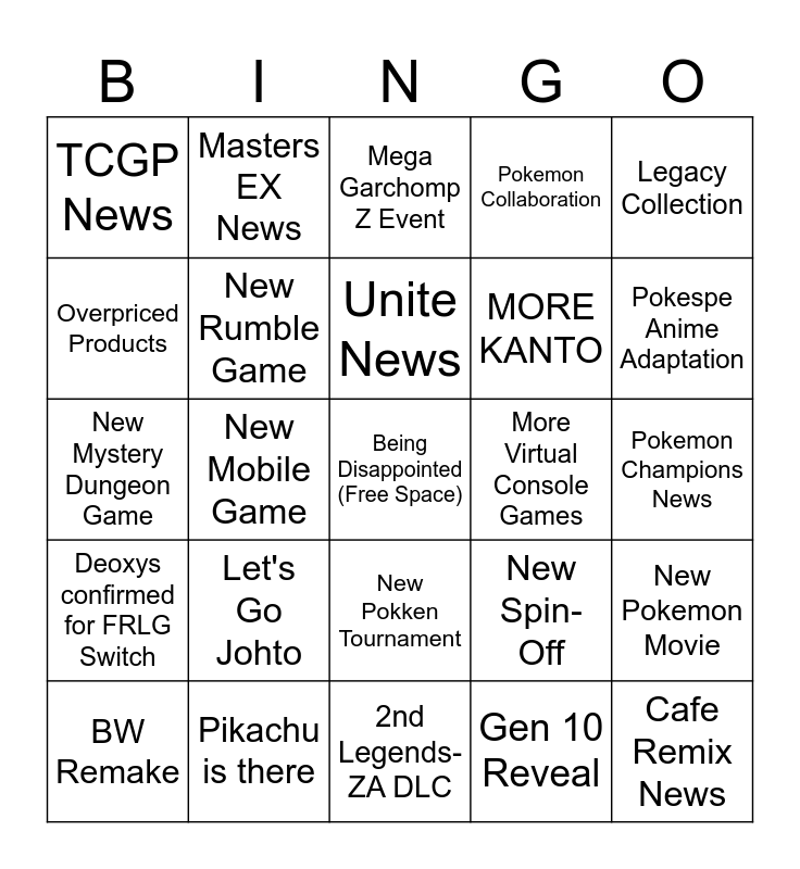This bingo card has a free space and 24 words: BW Remake, Let's Go Johto, Unite News, Gen 10 Reveal, Legacy Collection, TCGP News, Masters EX News, Mega Garchomp Z Event, More Virtual Console Games, Pokemon Champions News, New Mystery Dungeon Game, New Rumble Game, New Spin-Off, New Pokemon Movie, Overpriced Products, Pikachu is there, 2nd Legends-ZA DLC, Pokemon Collaboration, Pokespe Anime Adaptation, Deoxys confirmed for FRLG Switch, New Mobile Game, New Pokken Tournament, MORE KANTO and Cafe Remix News.