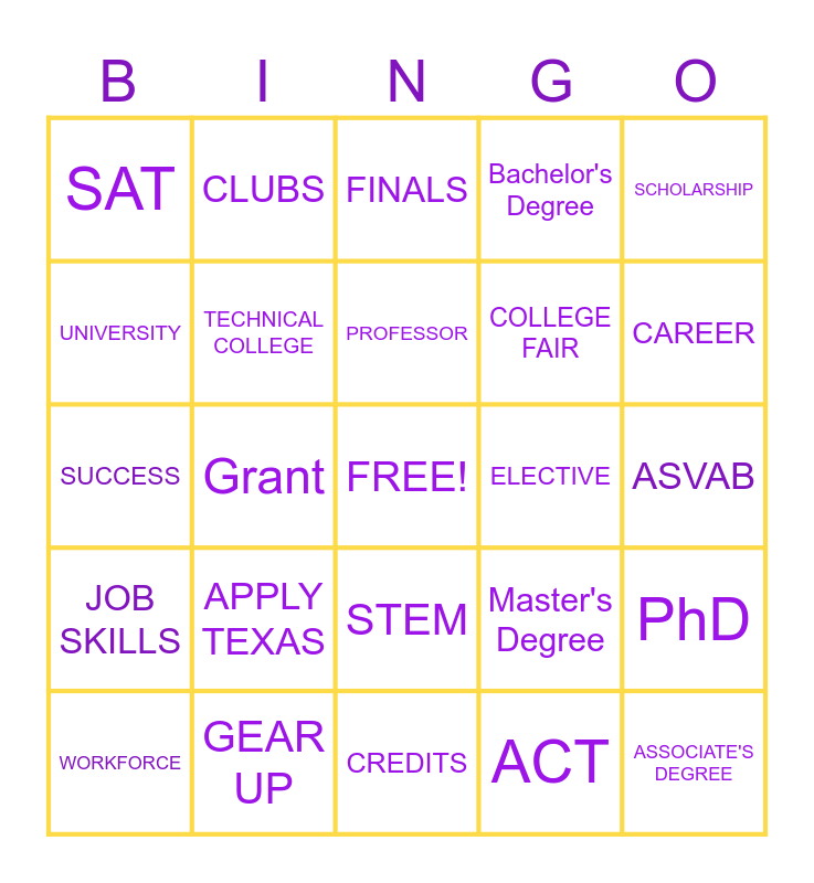This bingo card has a free space and 50 words: GPA, ASSOCIATE'S DEGREE, GRADUATION, CREDITS, APPLY TEXAS, COLLEGE MAJOR, CLUBS, DORMS, UNIVERSITY, COMMUNITY COLLEGE, TECHNICAL COLLEGE, Bachelor's Degree, PhD, Master's Degree, INTERNSHIP, TUITION, PROFESSOR, ELECTIVE, FINANCIAL AID, SCHOLARSHIP, Grant, ACT, SAT, COLLEGE FAIR, ADVISOR, CAMPUS, CAREER, DEAN, FINALS, STEM, FAFSA, COURSE LOAD, SPORTS, TUTORS, GEAR UP, Dual Enrollment, MAJOR, MINOR, DUAL ENROLLMENT, ASVAB, GI Bill, RESUME, MILITARY, CERTIFICATION, WORKFORCE, SUCCESS, FUTURE, LEADERSHIP, JOB SKILLS and FINANCIAL LITERACY.