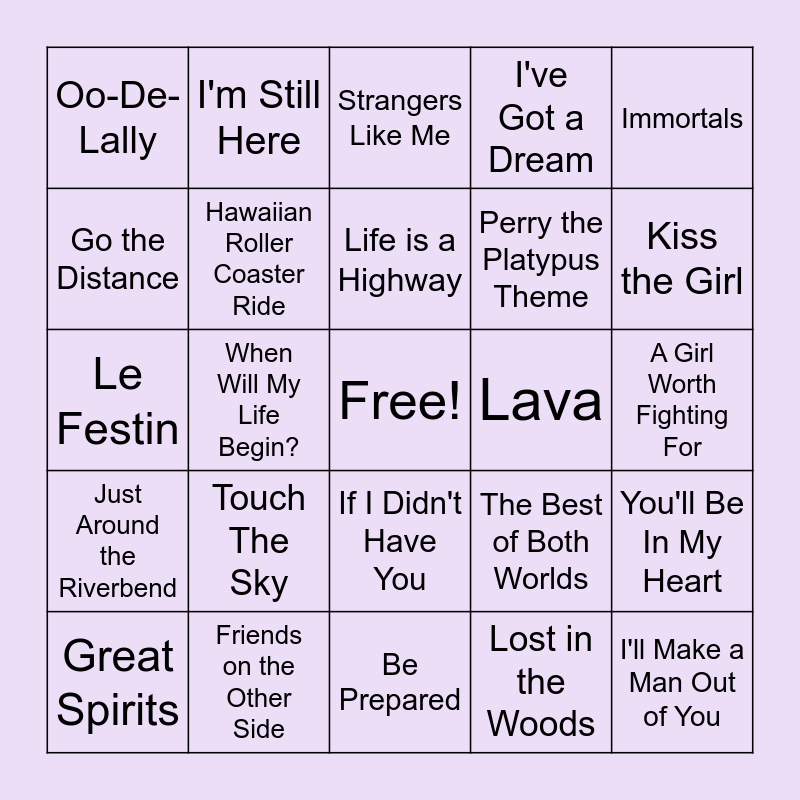 This bingo card has a free space and 37 words: I Just Can't Wait to Be King, How Far I'll Go, Zero to Hero, Hawaiian Roller Coaster Ride, You'll Be In My Heart, Touch The Sky, Life is a Highway, Almost There, Immortals, Un Poco Loco, When Will My Life Begin?, I've Got a Dream, I'll Make a Man Out of You, A Girl Worth Fighting For, Go the Distance, Just Around the Riverbend, When Can I See You Again?, Strangers Like Me, If I Didn't Have You, Lava, Oo-De-Lally, Kiss the Girl, Great Spirits, Be Prepared, Shiny, Lost in the Woods, I'm Still Here, Bop To The Top, Something There, On My Way, I Won't Say (I'm In Love), Friends on the Other Side, Le Festin, Everything Is Not As It Seems, The Best of Both Worlds, Perry the Platypus Theme and S.I.M.P.