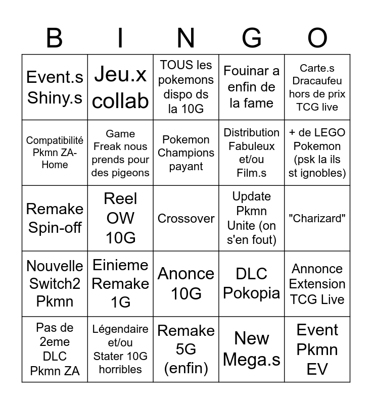 This bingo card has 25 words: Einieme Remake 1G, Remake 5G (enfin), Pokemon Champions payant, Pas de 2eme DLC Pkmn ZA, Carte.s Dracaufeu hors de prix TCG live, Event.s Shiny.s, Compatibilité Pkmn ZA-Home, Jeu.x collab, Update Pkmn Unite (on s'en fout), Anonce 10G, Distribution Fabuleux et/ou Film.s, Remake Spin-off, DLC Pokopia, Annonce Extension TCG Live, Game Freak nous prends pour des pigeons, Event Pkmn EV, "Charizard", TOUS les pokemons dispo ds la 10G, + de LEGO Pokemon (psk la ils st ignobles), Reel OW 10G, Crossover, Légendaire et/ou Stater 10G horribles, Nouvelle Switch2 Pkmn, Fouinar a enfin de la fame and New Mega.s.