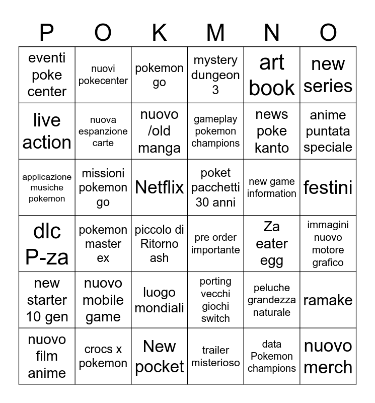 This bingo card has 42 words: dlc P-za, missioni pokemon go, gameplay pokopia, mystery dungeon 3, new game information, immagini nuovo motore grafico, live action, remake bianco e nero, pokemon go, gameplay pokemon champions, news poke kanto, anime puntata speciale, eventi poke center, nuova espanzione carte, New pocket, poket pacchetti 30 anni, data Pokemon champions, festini, new starter 10 gen, nuovi pokecenter, nuovo /old manga, porting vecchi giochi switch, Za eater egg, new series, nuovo film anime, crocs x pokemon, piccolo di Ritorno ash, nuovo legende, peluche grandezza naturale, nuovo merch, pokemon sleep, nuovo mobile game, Netflix, pre order importante, pokemon unite, ramake, applicazione musiche pokemon, pokemon master ex, luogo mondiali, trailer misterioso, art book and gioielli.