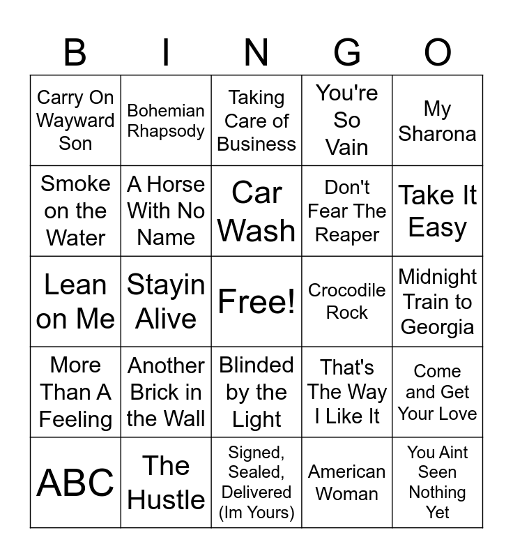This bingo card has a free space and 63 words: Dancing Queen, Sweet Home Alabama, Riders of the Storm, Come and Get Your Love, Shake Your Groove Thing, Le Freak, Bohemian Rhapsody, You Should Be Dancing, Car Wash, Hotel California, Blinded by the Light, Boogie Oogie Oogie, Midnight Train to Georgia, My Sharona, Lady Marmalade, Smoke on the Water, Stayin Alive, Carry On Wayward Son, Superstition, Don't Fear The Reaper, Another Brick in the Wall, More Than A Feeling, You're So Vain, Papa Was a Rollin Stone, Love Train, Take Me Home, Country Road, Sultans of Swing, Aint No Sunshine, Free Bird, The Boys are Back in Town, Thunder Road, YMCA, Stairway to Heaven, Take It Easy, ABC, Let it Be, American Woman, Mama Told Me, A Horse With No Name, Lean on Me, Crocodile Rock, Bad Boy Leroy Brown, Hooked on a Feeling, You Aint Seen Nothing Yet, The Hustle, Get Down Tonight, That's The Way I Like It, Boogie Fever, You Sexy Thing, We Are Family, Signed, Sealed, Delivered (Im Yours), Funkytown, Kung Fu Fighting, Knock on Wood, Taking Care of Business, Barracuda, Born to Run, Bennie and the Jets, Brick house, Bridge Over Troubled Water, Imagine and Old Time Rock and Roll.