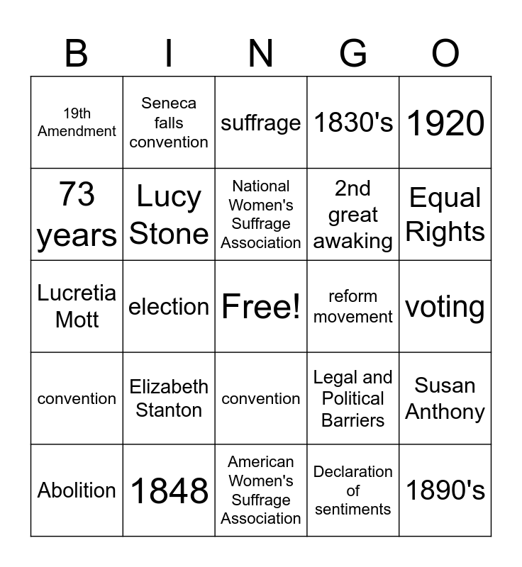 This bingo card has a free space and 24 words: Elizabeth Stanton, 1848, National Women's Suffrage Association, Abolition, 1920, 19th Amendment, 73 years, Seneca falls convention, reform movement, convention, 2nd great awaking, Lucretia Mott, Legal and Political Barriers, Susan Anthony, Lucy Stone, Declaration of sentiments, voting, suffrage, Equal Rights, election, 1890's, convention, 1830's and American Women's Suffrage Association.
