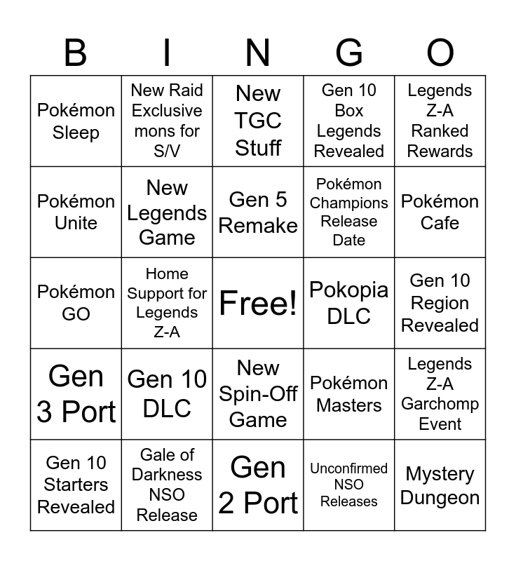 This bingo card has a free space and 24 words: Gen 10 Starters Revealed, Gen 10 DLC, Gen 5 Remake, Unconfirmed NSO Releases, Legends Z-A Ranked Rewards, Pokémon Sleep, New Raid Exclusive mons for S/V, New TGC Stuff, Pokopia DLC, Gen 10 Region Revealed, Pokémon GO, New Legends Game, Pokémon Masters, Legends Z-A Garchomp Event, Pokémon Unite, Gale of Darkness NSO Release, Gen 2 Port, Gen 10 Box Legends Revealed, Pokémon Cafe, Gen 3 Port, Home Support for Legends Z-A, New Spin-Off Game, Pokémon Champions Release Date and Mystery Dungeon.