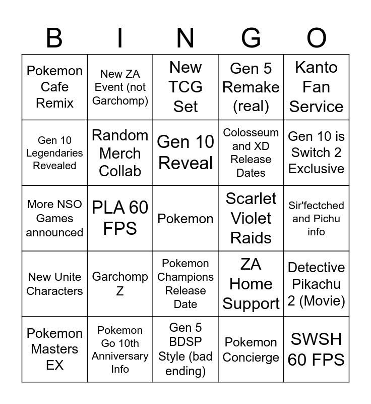 This bingo card has a free space and 24 words: Garchomp Z, Pokemon Go 10th Anniversary Info, Gen 10 Reveal, Pokemon Masters EX, Kanto Fan Service, Pokemon Cafe Remix, Gen 10 Legendaries Revealed, New ZA Event (not Garchomp), Scarlet Violet Raids, Pokemon Champions Release Date, Colosseum and XD Release Dates, More NSO Games announced, ZA Home Support, Detective Pikachu 2 (Movie), Random Merch Collab, Pokemon Concierge, Sir'fectched and Pichu info, New TCG Set, Gen 10 is Switch 2 Exclusive, PLA 60 FPS, SWSH 60 FPS, New Unite Characters, Gen 5 Remake (real) and Gen 5 BDSP Style (bad ending).