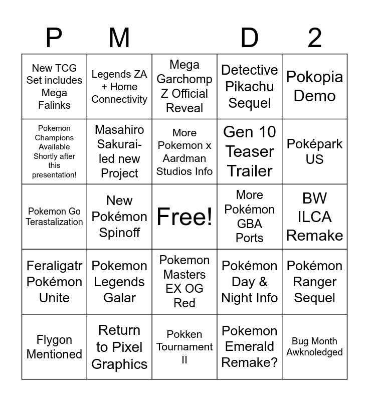This bingo card has a free space and 24 words: Pokemon Legends Galar, Return to Pixel Graphics, More Pokemon x Aardman Studios Info, Flygon Mentioned, Pokopia Demo, New TCG Set includes Mega Falinks, Pokemon Champions Available Shortly after this presentation!, Legends ZA + Home Connectivity, More Pokémon GBA Ports, Pokemon Masters EX OG Red, Gen 10 Teaser Trailer, Pokemon Go Terastalization, Pokémon Day & Night Info, Pokémon Ranger Sequel, Masahiro Sakurai-led new Project, Pokemon Emerald Remake?, BW ILCA Remake, Mega Garchomp Z Official Reveal, Poképark US, New Pokémon Spinoff, Bug Month Awknoledged, Feraligatr Pokémon Unite, Detective Pikachu Sequel and Pokken Tournament II.