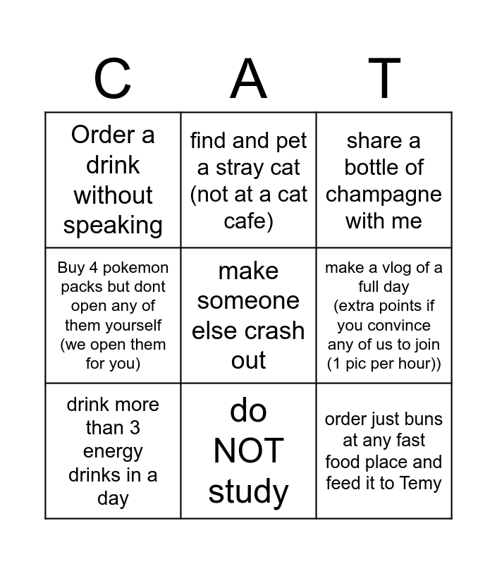 This bingo card has 9 words: drink more than 3 energy drinks in a day, share a bottle of champagne with me, find and pet a stray cat (not at a cat cafe), Buy 4 pokemon packs but dont open any of them yourself (we open them for you), Order a drink without speaking, make a vlog of a full day (extra points if you convince any of us to join (1 pic per hour)), make someone else crash out, order just buns at any fast food place and feed it to Temy and do NOT study.