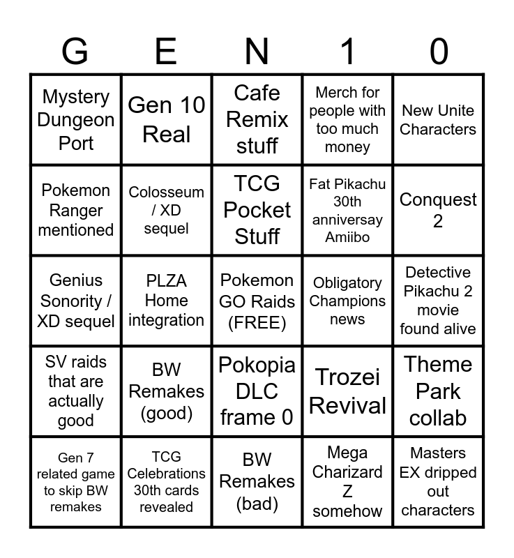 This bingo card has a free space and 24 words: BW Remakes (good), TCG Celebrations 30th cards revealed, TCG Pocket Stuff, Gen 7 related game to skip BW remakes, New Unite Characters, Mystery Dungeon Port, Pokemon Ranger mentioned, Gen 10 Real, Obligatory Champions news, Pokopia DLC frame 0, Fat Pikachu 30th anniversay Amiibo, Genius Sonority / XD sequel, Trozei Revival, Theme Park collab, Colosseum / XD sequel, Mega Charizard Z somehow, Detective Pikachu 2 movie found alive, Cafe Remix stuff, Conquest 2, PLZA Home integration, Masters EX dripped out characters, SV raids that are actually good, Merch for people with too much money and BW Remakes (bad).