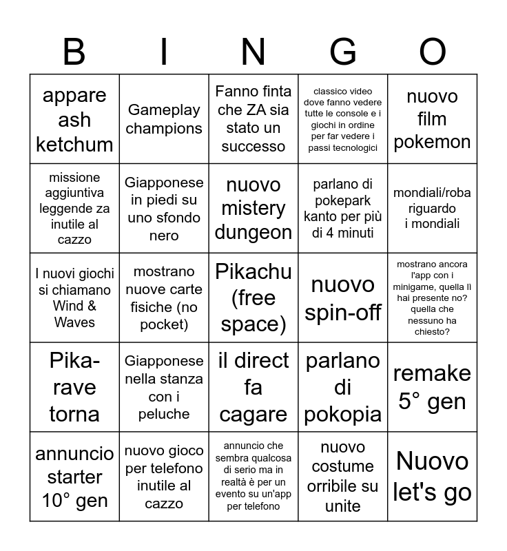 This bingo card has a free space and 24 words: Giapponese nella stanza con i peluche, nuovo gioco per telefono inutile al cazzo, nuovo mistery dungeon, annuncio starter 10° gen, nuovo film pokemon, appare ash ketchum, missione aggiuntiva leggende za inutile al cazzo, Gameplay champions, nuovo spin-off, il direct fa cagare, parlano di pokepark kanto per più di 4 minuti, I nuovi giochi si chiamano Wind & Waves, parlano di pokopia, remake 5° gen, Giapponese in piedi su uno sfondo nero, nuovo costume orribile su unite, mostrano ancora l'app con i minigame, quella lì hai presente no? quella che nessuno ha chiesto?, Fanno finta che ZA sia stato un successo, mondiali/roba riguardo i mondiali, mostrano nuove carte fisiche (no pocket), Nuovo let's go, Pika-rave torna, classico video dove fanno vedere tutte le console e i giochi in ordine per far vedere i passi tecnologici and annuncio che sembra qualcosa di serio ma in realtà è per un evento su un'app per telefono.
