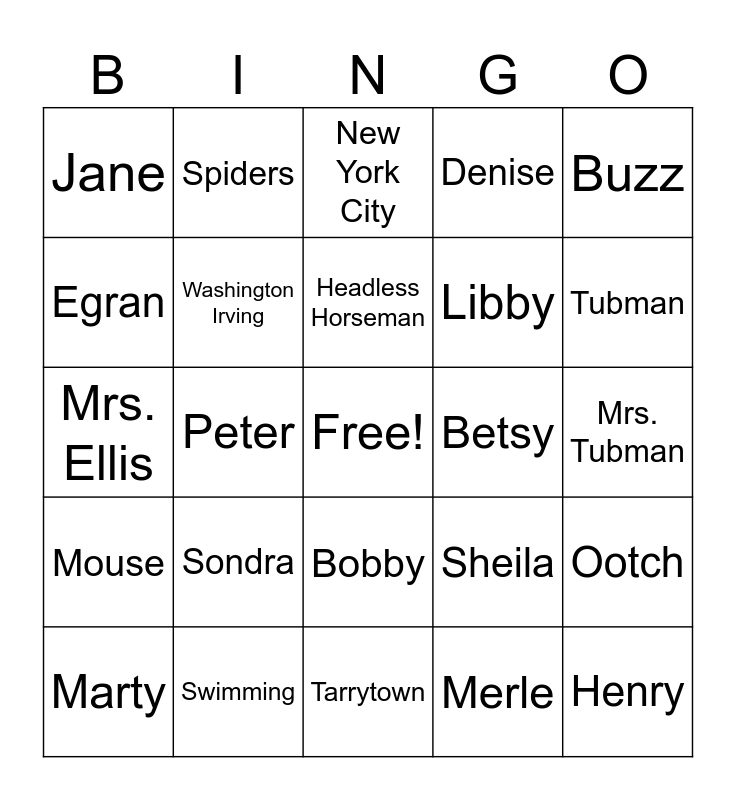 This bingo card has a free space and 27 words: Sheila, Jennifer, Libby, Tarrytown, Egran, New York City, Spiders, Mouse, Betsy, Ootch, Mrs. Ellis, Denise, Marty, Swimming, Tubman, Yo-yo, Washington Irving, Headless Horseman, Sondra, Jane, Mrs. Tubman, Merle, Peter, Henry, Bobby, Buzz and Sunny.