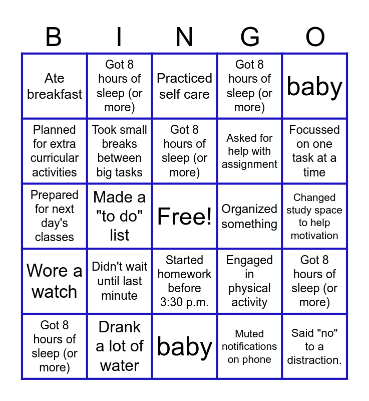 This bingo card has a free space and 29 words: Got 8 hours of sleep (or more), Used a planner to track homework, Made a "to do" list, Used a timer to time tasks, Ate breakfast, Practiced self care, Took small breaks between big tasks, Didn't wait until last minute, Organized something, Drank a lot of water, Changed study space to help motivation, Said "no" to a distraction., baby, Muted notifications on phone, Focussed on one task at a time, Set daily goals, Started homework before 3:30 p.m., Wore a watch, baby, Prepared for next day's classes, Engaged in physical activity, Attended all classes on time, Asked for help with assignment, Planned for extra curricular activities, Got 8 hours of sleep (or more), Got 8 hours of sleep (or more), Got 8 hours of sleep (or more), Got 8 hours of sleep (or more) and Got 8 hours of sleep (or more).