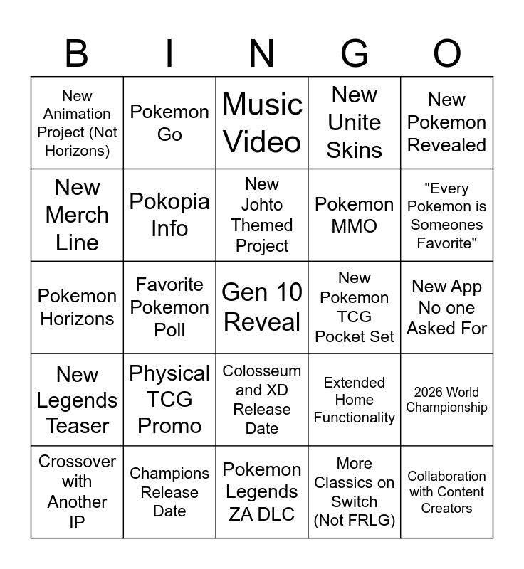 This bingo card has a free space and 24 words: Physical TCG Promo, Champions Release Date, New Johto Themed Project, Crossover with Another IP, New Pokemon Revealed, New Animation Project (Not Horizons), New Merch Line, Pokemon Go, New Pokemon TCG Pocket Set, Colosseum and XD Release Date, Pokemon MMO, Pokemon Horizons, Extended Home Functionality, 2026 World Championship, Pokopia Info, More Classics on Switch (Not FRLG), New App No one Asked For, Music Video, "Every Pokemon is Someones Favorite", Favorite Pokemon Poll, Collaboration with Content Creators, New Legends Teaser, New Unite Skins and Pokemon Legends ZA DLC.